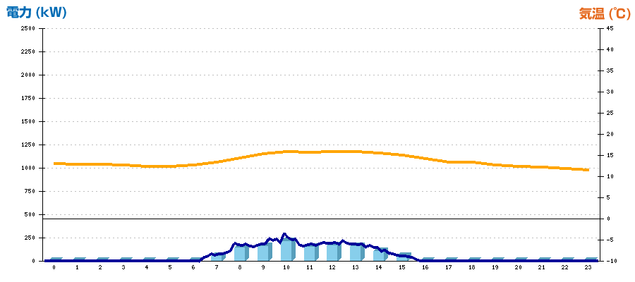 | 時刻 | 日射強度 (kW/㎡) | 気温 (℃) | 発電電力量 (kWh) | CO2削減量 (kg-CO2) | 売電金額(概算) (円) |