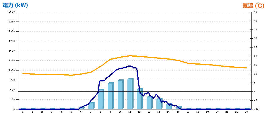| 時刻 | 日射強度 (kW/㎡) | 気温 (℃) | 発電電力量 (kWh) | CO2削減量 (kg-CO2) | 売電金額(概算) (円) |