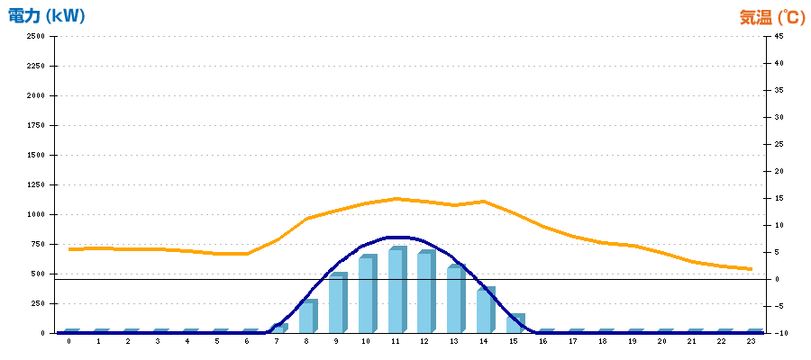| 時刻 | 日射強度 (kW/㎡) | 気温 (℃) | 発電電力量 (kWh) | CO2削減量 (kg-CO2) | 売電金額(概算) (円) |
