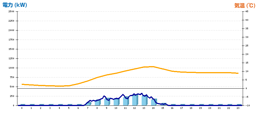 | 時刻 | 日射強度 (kW/㎡) | 気温 (℃) | 発電電力量 (kWh) | CO2削減量 (kg-CO2) | 売電金額(概算) (円) |