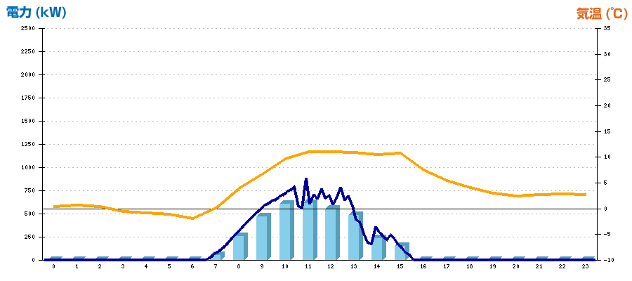 | 時刻 | 日射強度 (kW/㎡) | 気温 (℃) | 発電電力量 (kWh) | CO2削減量 (kg-CO2) | 売電金額(概算) (円) |