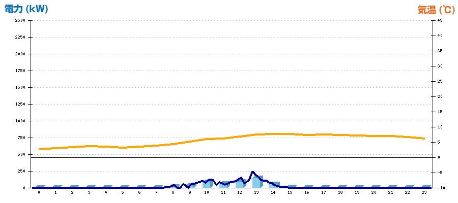 | 時刻 | 日射強度 (kW/㎡) | 気温 (℃) | 発電電力量 (kWh) | CO2削減量 (kg-CO2) | 売電金額(概算) (円) |