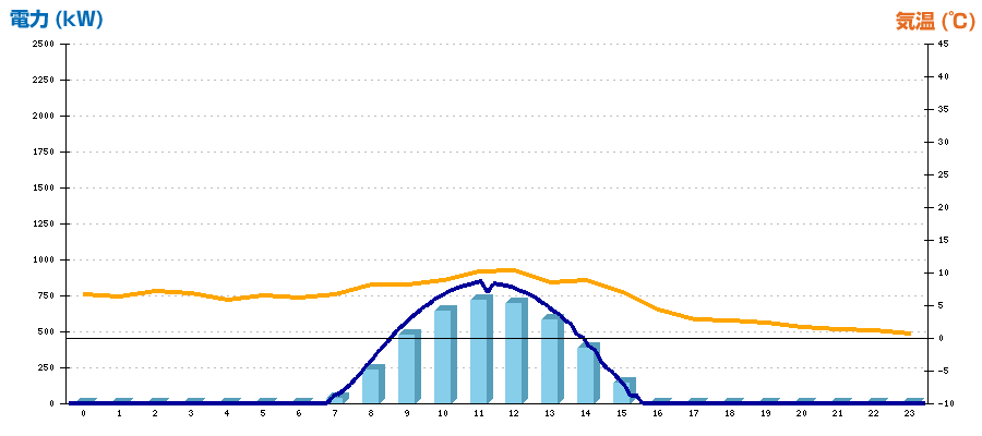 | 時刻 | 日射強度 (kW/㎡) | 気温 (℃) | 発電電力量 (kWh) | CO2削減量 (kg-CO2) | 売電金額(概算) (円) |
