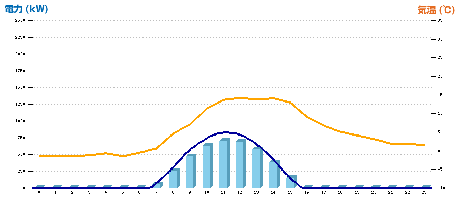 | 時刻 | 日射強度 (kW/㎡) | 気温 (℃) | 発電電力量 (kWh) | CO2削減量 (kg-CO2) | 売電金額(概算) (円) |