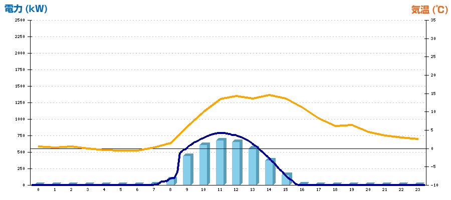| 時刻 | 日射強度 (kW/㎡) | 気温 (℃) | 発電電力量 (kWh) | CO2削減量 (kg-CO2) | 売電金額(概算) (円) |