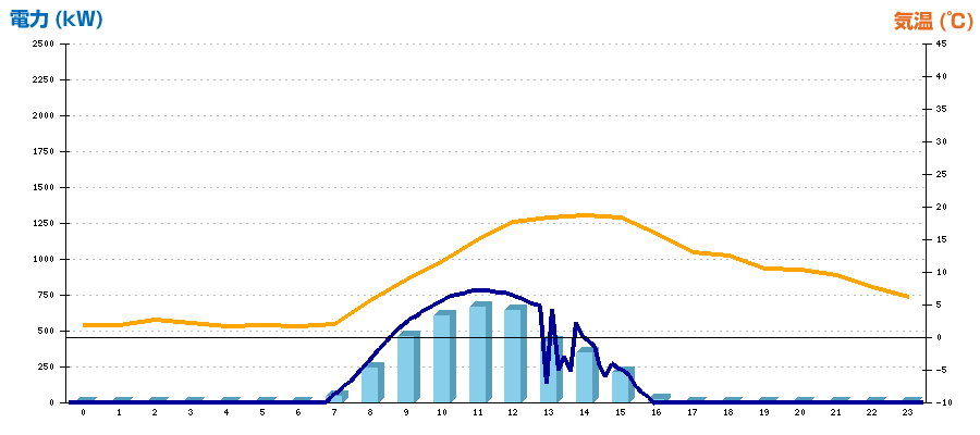 | 時刻 | 日射強度 (kW/㎡) | 気温 (℃) | 発電電力量 (kWh) | CO2削減量 (kg-CO2) | 売電金額(概算) (円) |