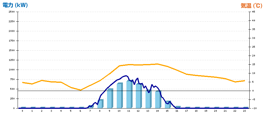 | 時刻 | 日射強度 (kW/㎡) | 気温 (℃) | 発電電力量 (kWh) | CO2削減量 (kg-CO2) | 売電金額(概算) (円) |