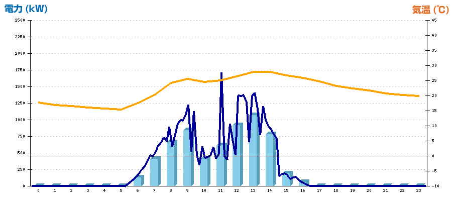時刻 | 日射強度 (kW/㎡) | 気温 (℃) | 発電電力量 (kWh) | CO2削減量 (kg-CO2) | 売電金額(概算) (円) |