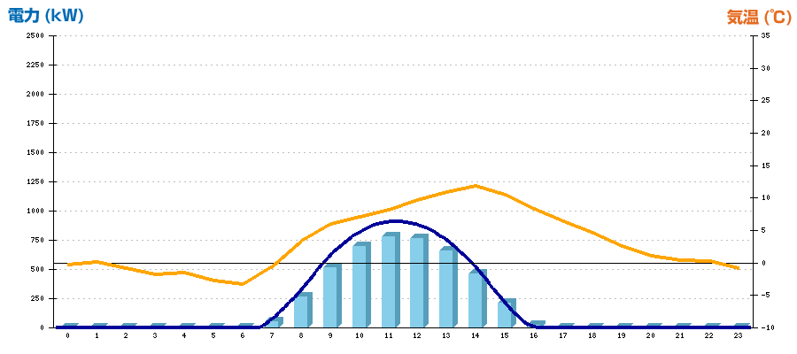 | 時刻 | 日射強度 (kW/㎡) | 気温 (℃) | 発電電力量 (kWh) | CO2削減量 (kg-CO2) | 売電金額(概算) (円) |