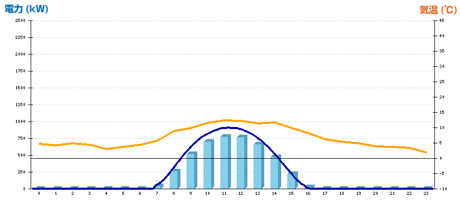 | 時刻 | 日射強度 (kW/㎡) | 気温 (℃) | 発電電力量 (kWh) | CO2削減量 (kg-CO2) | 売電金額(概算) (円) |