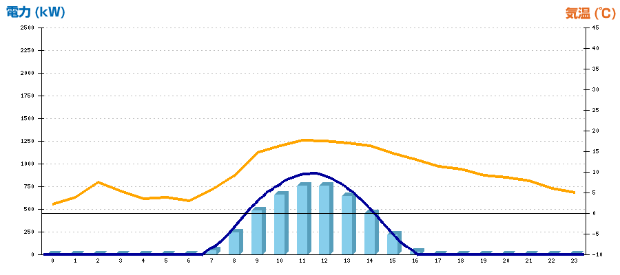 | 時刻 | 日射強度 (kW/㎡) | 気温 (℃) | 発電電力量 (kWh) | CO2削減量 (kg-CO2) | 売電金額(概算) (円) |