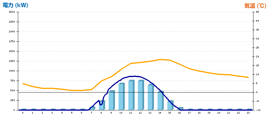 | 時刻 | 日射強度 (kW/㎡) | 気温 (℃) | 発電電力量 (kWh) | CO2削減量 (kg-CO2) | 売電金額(概算) (円) |