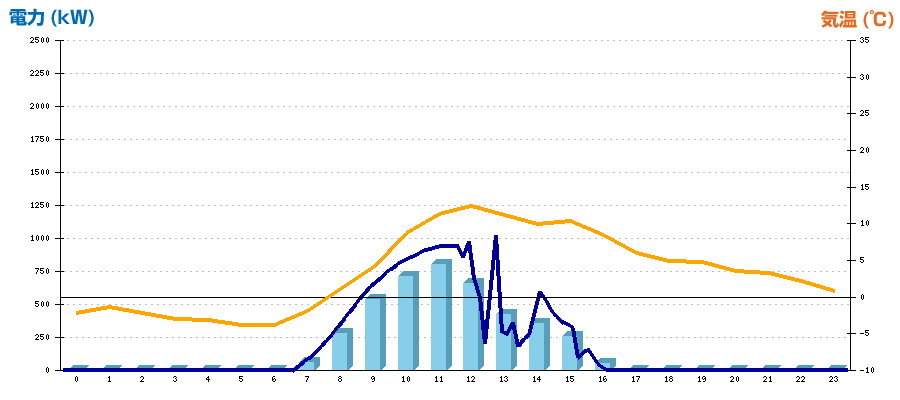 | 時刻 | 日射強度 (kW/㎡) | 気温 (℃) | 発電電力量 (kWh) | CO2削減量 (kg-CO2) | 売電金額(概算) (円) |