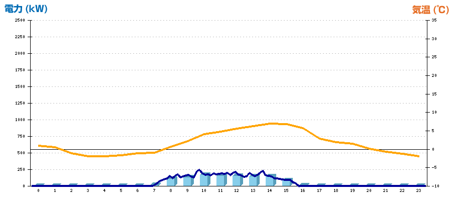 | 時刻 | 日射強度 (kW/㎡) | 気温 (℃) | 発電電力量 (kWh) | CO2削減量 (kg-CO2) | 売電金額(概算) (円) |