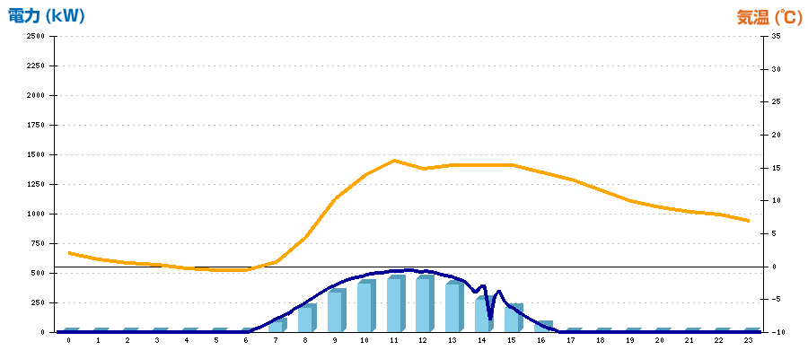 | 時刻 | 日射強度 (kW/㎡) | 気温 (℃) | 発電電力量 (kWh) | CO2削減量 (kg-CO2) | 売電金額(概算) (円) |