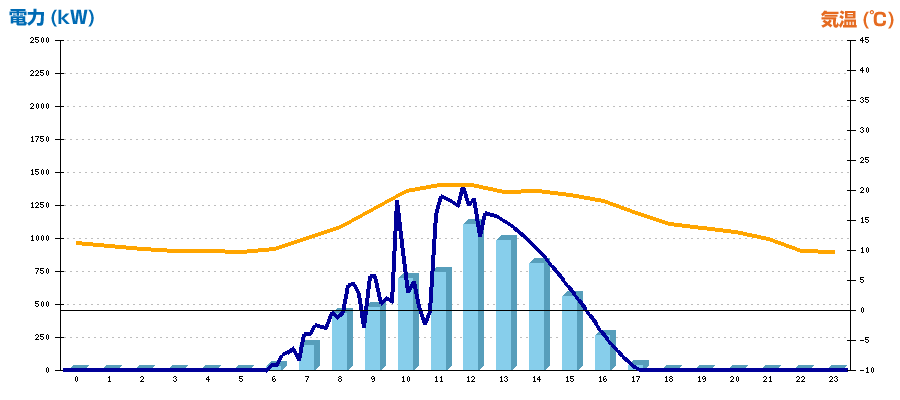 | 時刻 | 日射強度 (kW/㎡) | 気温 (℃) | 発電電力量 (kWh) | CO2削減量 (kg-CO2) | 売電金額(概算) (円) |