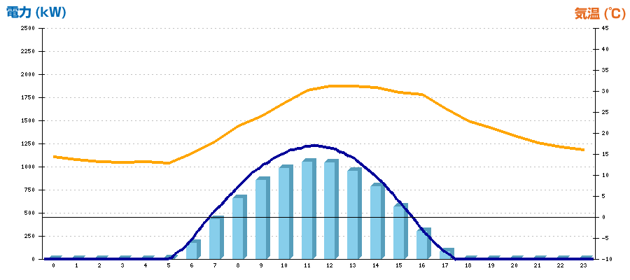 | 時刻 | 日射強度 (kW/㎡) | 気温 (℃) | 発電電力量 (kWh) | CO2削減量 (kg-CO2) | 売電金額(概算) (円) |