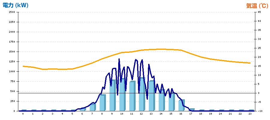 | 時刻 | 日射強度 (kW/㎡) | 気温 (℃) | 発電電力量 (kWh) | CO2削減量 (kg-CO2) | 売電金額(概算) (円) |