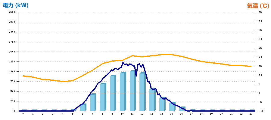 | 時刻 | 日射強度 (kW/㎡) | 気温 (℃) | 発電電力量 (kWh) | CO2削減量 (kg-CO2) | 売電金額(概算) (円) |